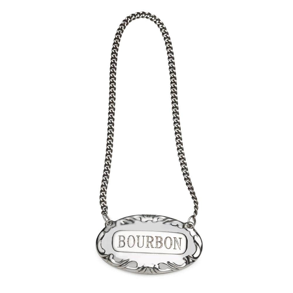 Add elegance to your home bar with this Empire Silver Bourbon Liquor Label. This liquor label includes a silver chain to hang around the neck of your decanter with the word "Bourbon". Bring the luxury of sterling to your cocktail hour for elegance and sophistication.