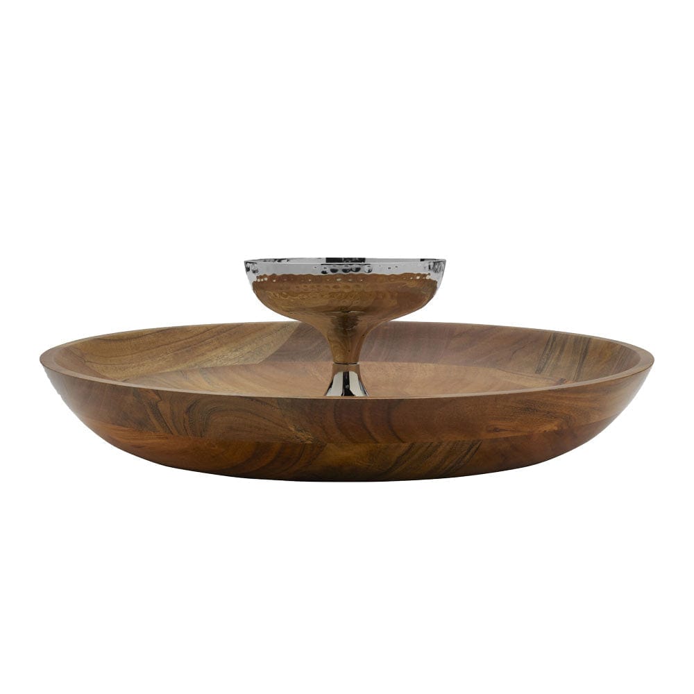 This Towle Hammersmith Wood Chip and Dip is beautifully crafted of acacia wood, with a metal alloy hammered raised bowl in the center. This gorgeous piece raises your chip and dip serving to a new level of elegance and sophistication.