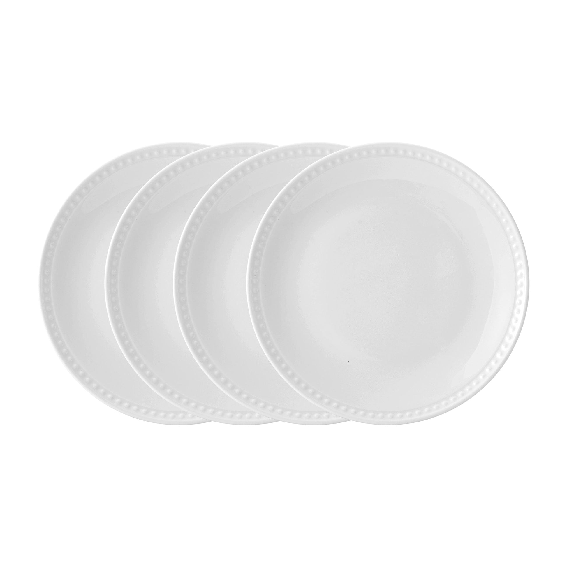 This Loria Set of 4 Salad Plates feature a pristine white background with a simplistic embossed bead design wrapping around the rim, and will add a touch of style to your table.