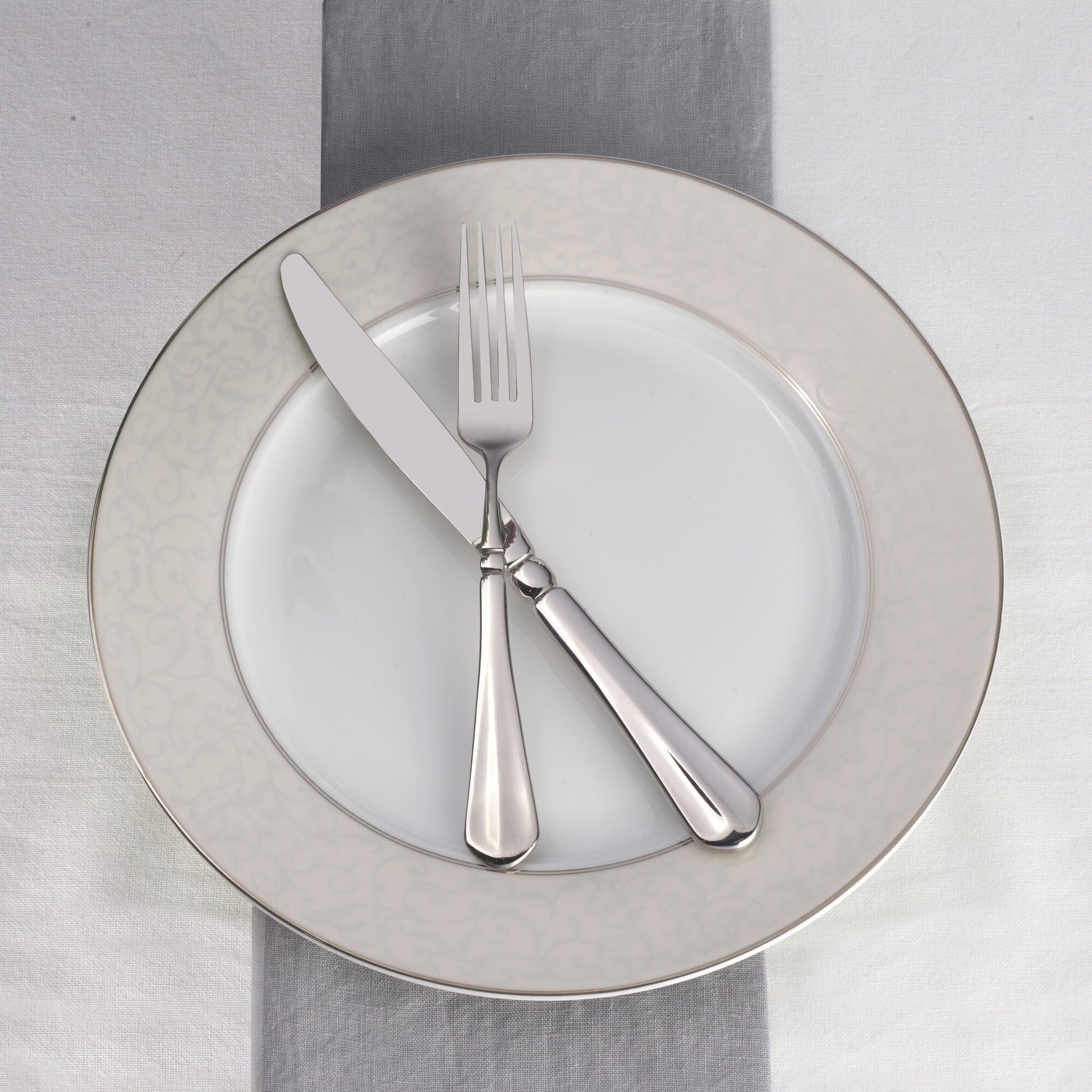 Parchment dinnerware features a gentle gray border embellished with a beautifully detailed scroll design. This chic and elegant collection is accented by inner and outer borders of platinum metallic banding.