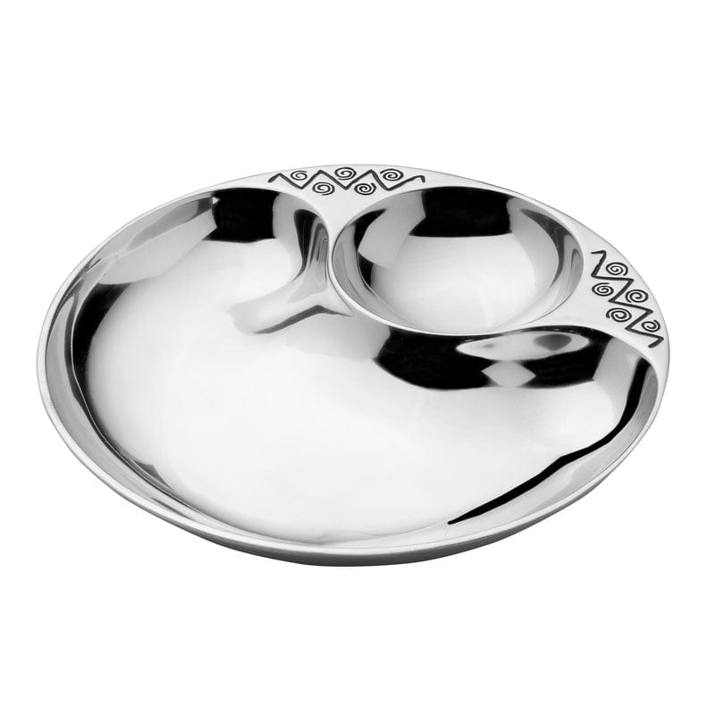 • Chip and dip measures 10 1/2-inches in diameter and sits 1 1/2-inches high • Made of Armetale metal, which is an aluminum-based alloy metal, that is 100% recycled, and food-safe • This piece will not rust, break, crack or chip under normal usage. Wilton products are oven to stovetop to freezer to refrigerator to table • Hand wash with a soft sponge or cloth and mild soap and warm water. Do not place in automatic dishwasher. Detergents, harsh chemicals and hard water will harm the metal's finishShare