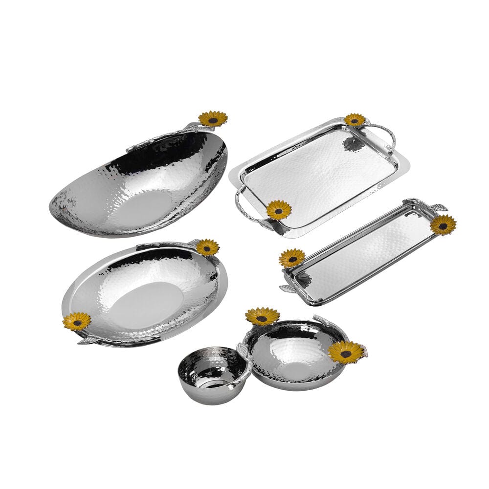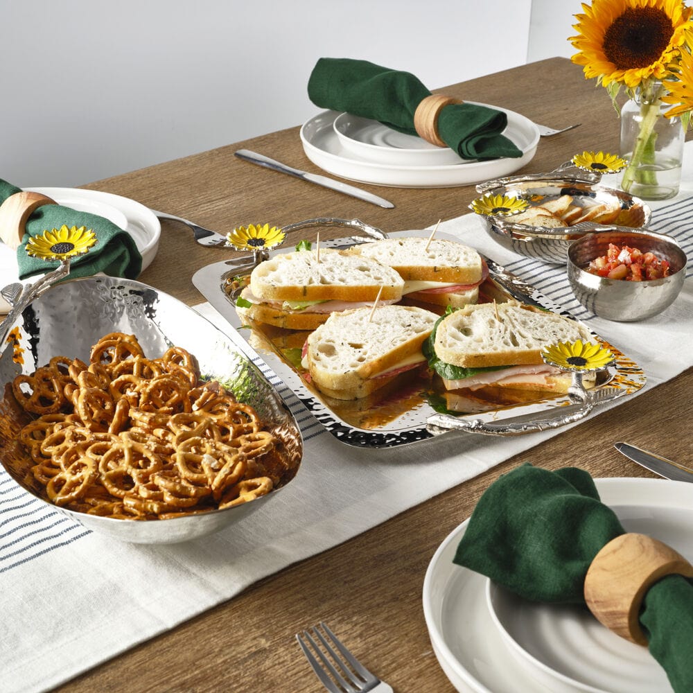 This elegant and lustrous Sunflower chip and dip server will brighten up any gathering. Designed to bring both beauty and functionality to your table, this stylish serving set. A captivating hammered interior, smooth exterior, and vibrant yellow sunflower and leaf accents. Make every party blossom with this eye-catching centerpiece that combines convenience, elegance, and a touch of sunny charm!
