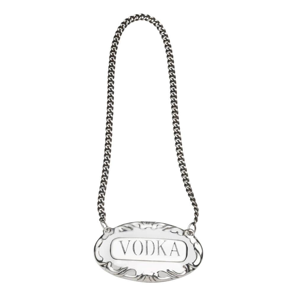 Add elegance to your home bar with this Empire Silver Vodka Liquor Label. This liquor label includes a silver chain to hang around the neck of your decanter with the word "Vodka ". Bring the luxury of sterling to your cocktail hour for elegance and sophistication.